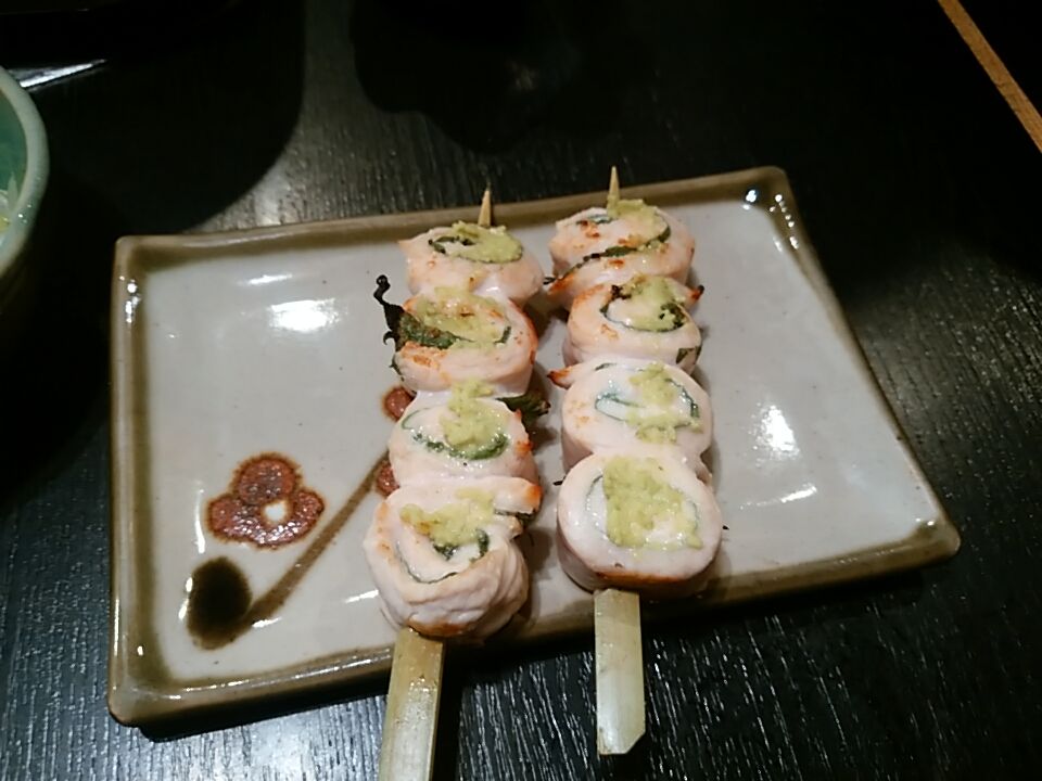 ササミシソ巻き、わさびが乗っている。軽く炙ってある。美味しい。