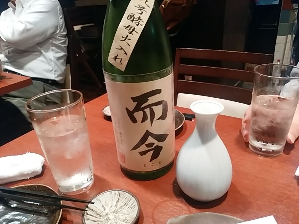 日本酒が豊富。注文すると証として瓶を置いてくれる。画像は而今(じこん)