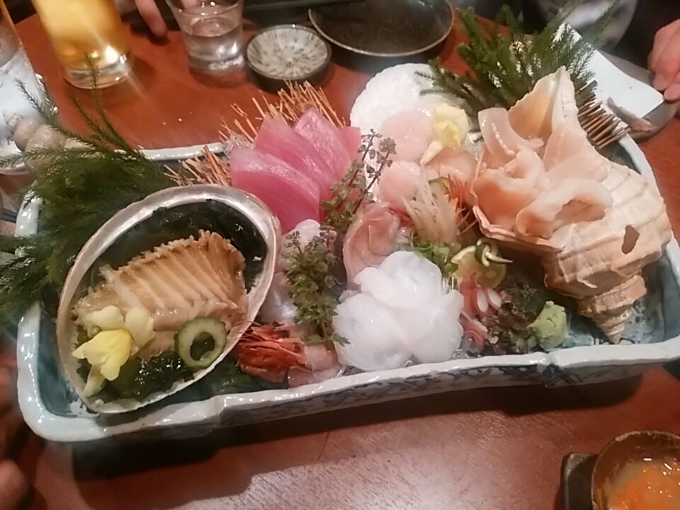 刺身盛り合わせ(値段不明。5000円ぐらいかな?)全て国産。すばらしい(~ヘ~;)(~ヘ~;)。アワビやアカガレイ、生タコ、巨大つぶ貝など鮮度良く 良質。