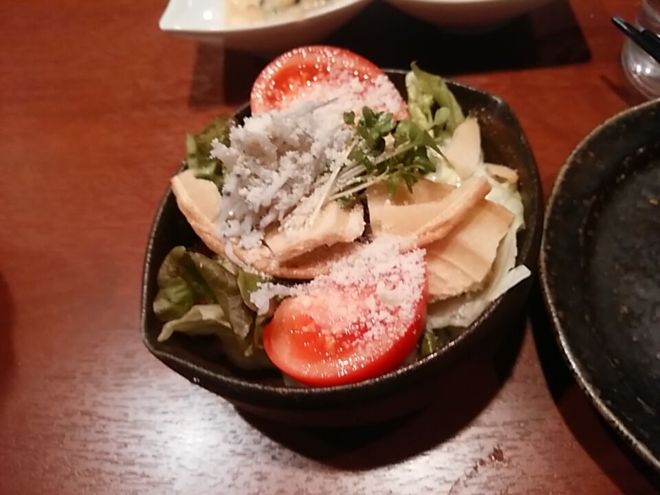 おまかせサラダ(780)、遅れて来る人がいたので人数分に分けてくれた。南部せんべいの砕いたのが入っている。