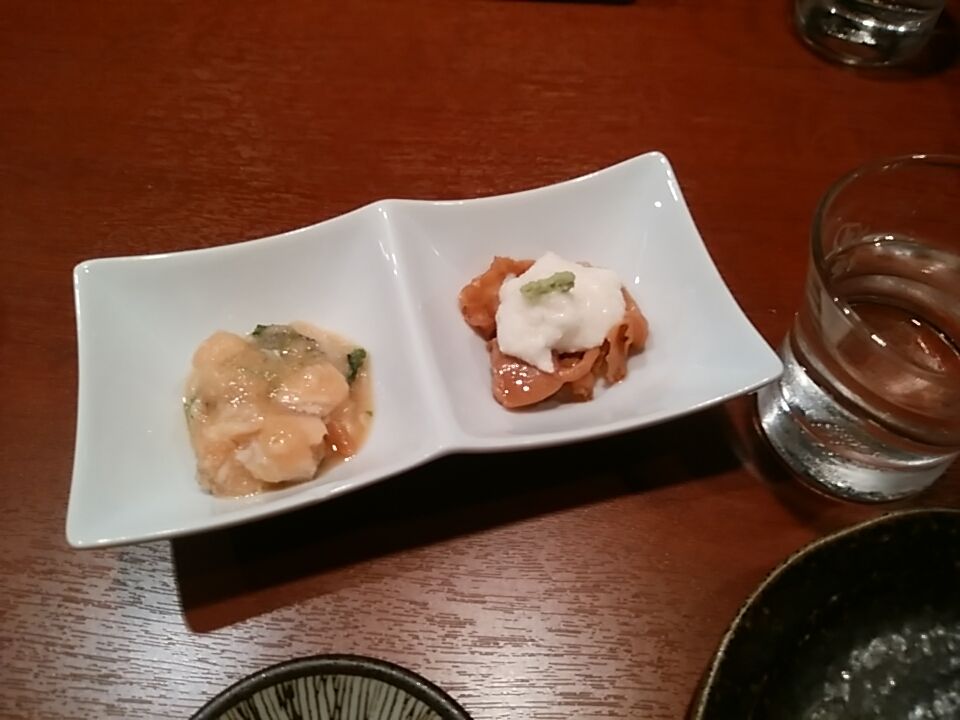 酒肴盛り合わせ(2000ぐらい)。ホヤとこのわたの塩辛 、つぶ貝わさび、サメなんこつ梅肉 など正に珍味! はぁ〜たまりません(;´Д`)