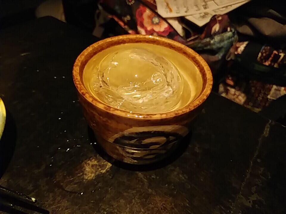 酒も充実している。焼酎ロックで頼むと丸い氷が入った器に焼酎を注いでもらい、パキパキと音を楽しめる。