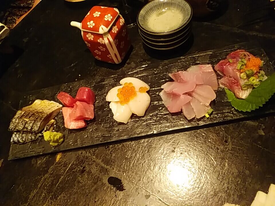 市場直送刺身盛り合せ、鮮度良く良質でとてもイイ。炙りしめ鯖美味いね。鮪も良質。
