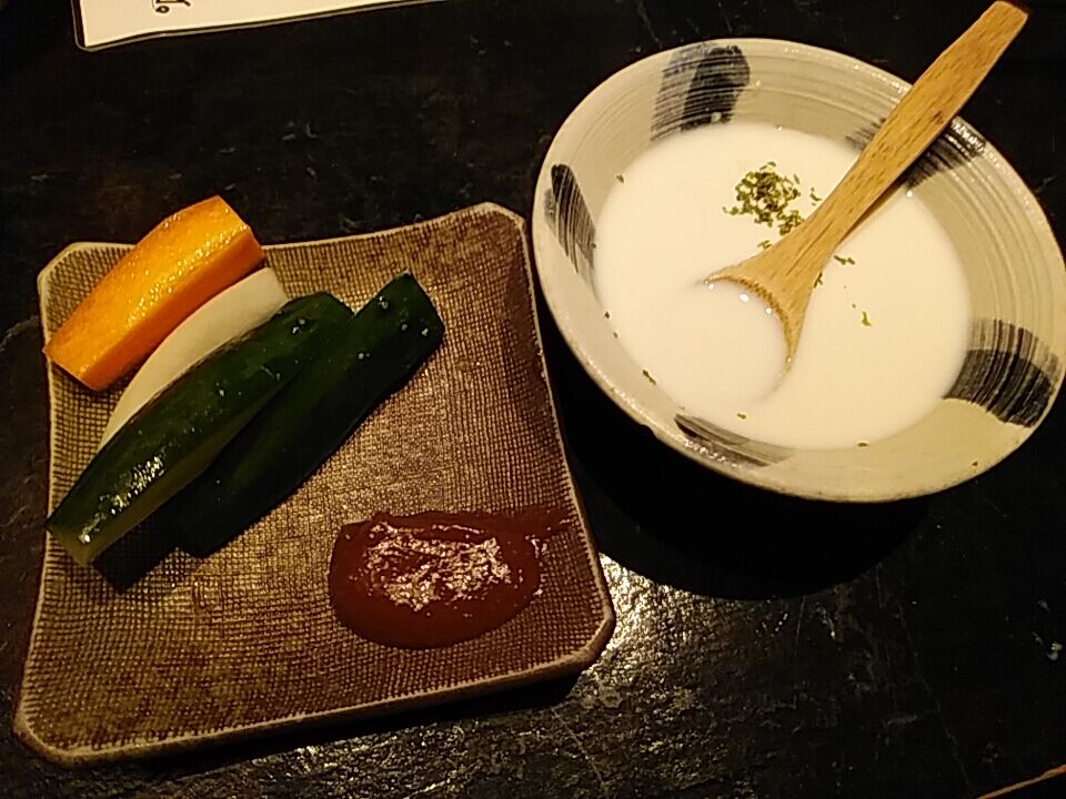野菜スティック味噌、冷製ポタージュ。美味しいです。