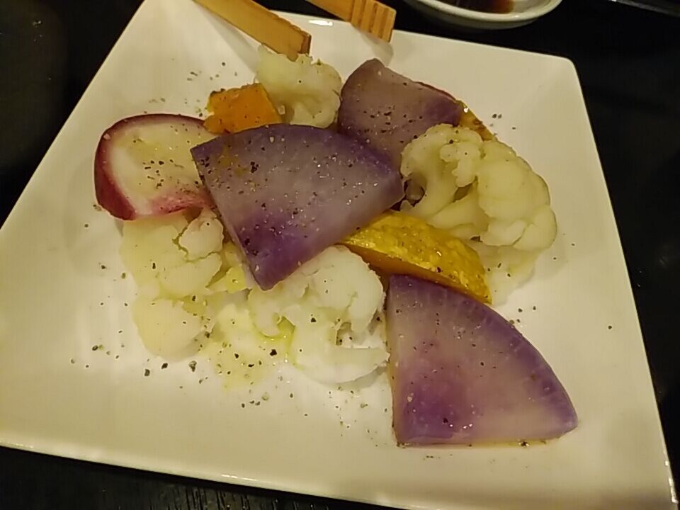 野菜蒸し。佐渡は農業も盛んらしい。味付けシンプルで美味い。